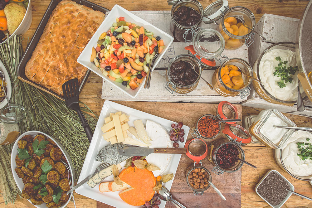 Eine bunte Obstauswahl mit Kiwi, Ananas, Melone, Trauben, Orangen und mehr. Diers Hof Milch, Joghurt und Quark sowie laktosefreie Milch stehen bereit. Hausgemachter Couscous-Salat, italienischer Pastasalat, Bauernsalat und eine Auswahl an Antipasti bringen frische Vielfalt auf den Tisch.
